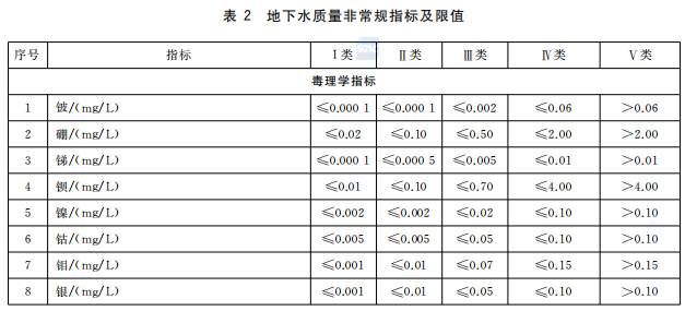 地下水質量指標分為常規指標和非常規指標,其分類及限值分別見表1和表2。